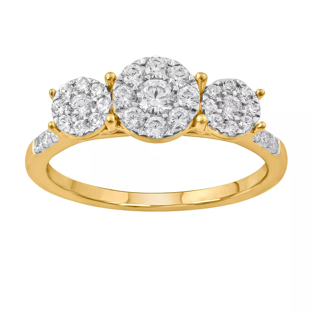 Featuring shimmering diamonds set in a three-stone cluster motif, this engagement ring is a wonderful symbol of your love.