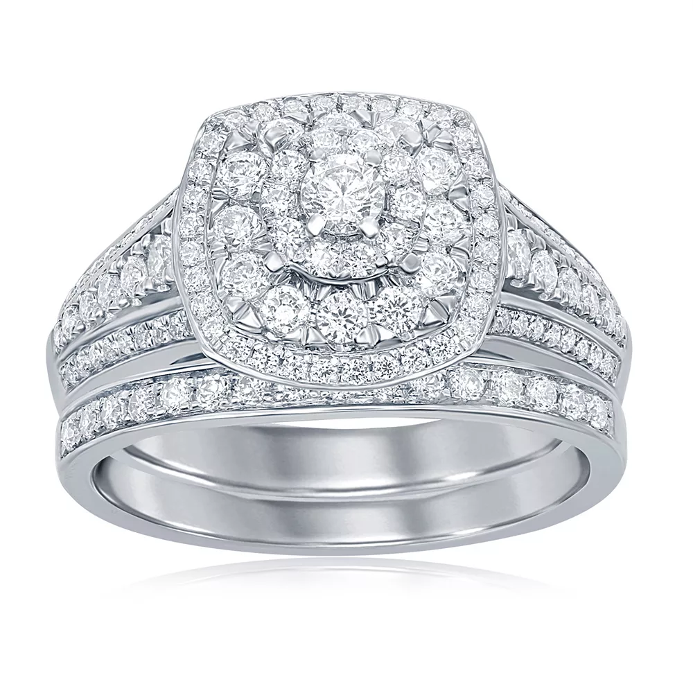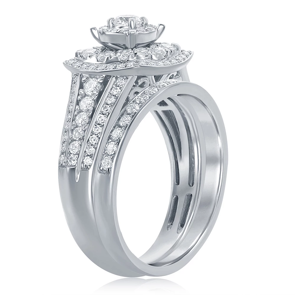 Tiers of round-cut diamonds serve as the dazzling focal point for this 14k white gold halo engagement ring set. A matching wedding band completes this beautiful pair.