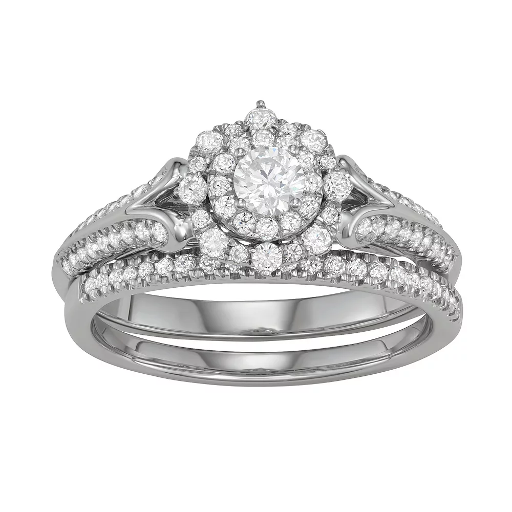 Adorned with a cluster of round-cut diamonds accompanied by diamond accents along the band, this beautiful Simply Vera Vera Wang bridal set is a magnificent symbol of your commitment.