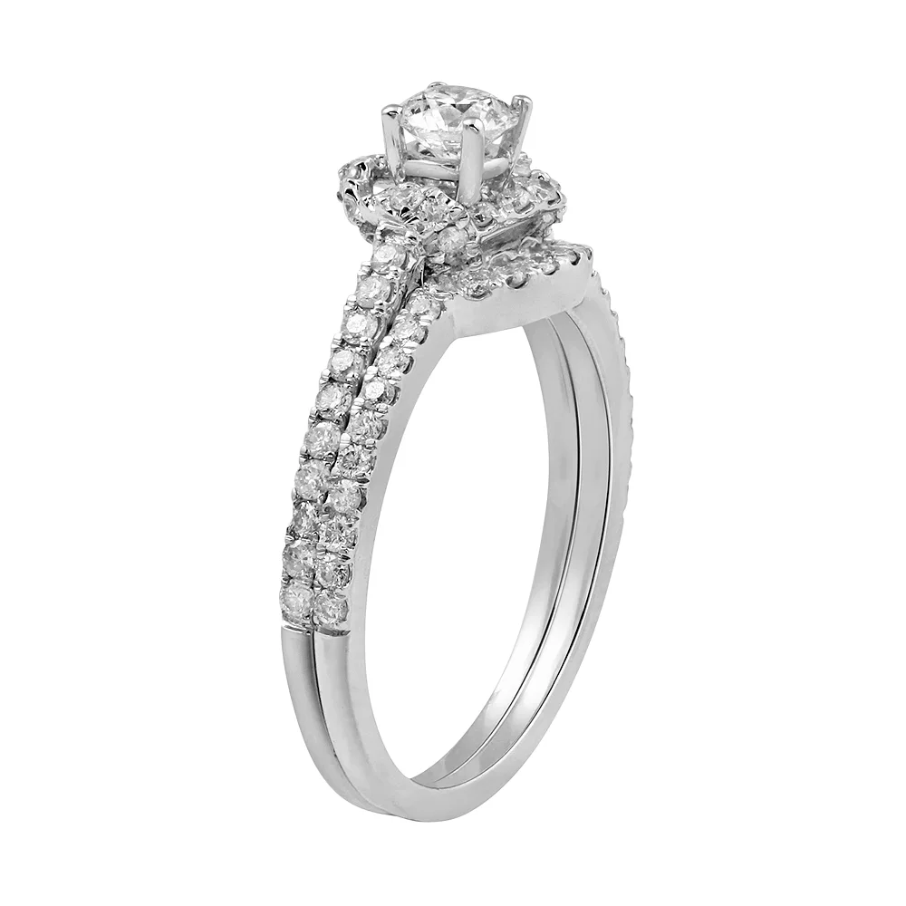 Celebrate your unconditional love when you present her with this 14k white gold engagement ring set. Decorated with round-cut diamonds, this Simply Vera Vera Wang halo engagement ring set is a stunning symbol of your commitment. Signature packaging includes a ring box and a gift bag.