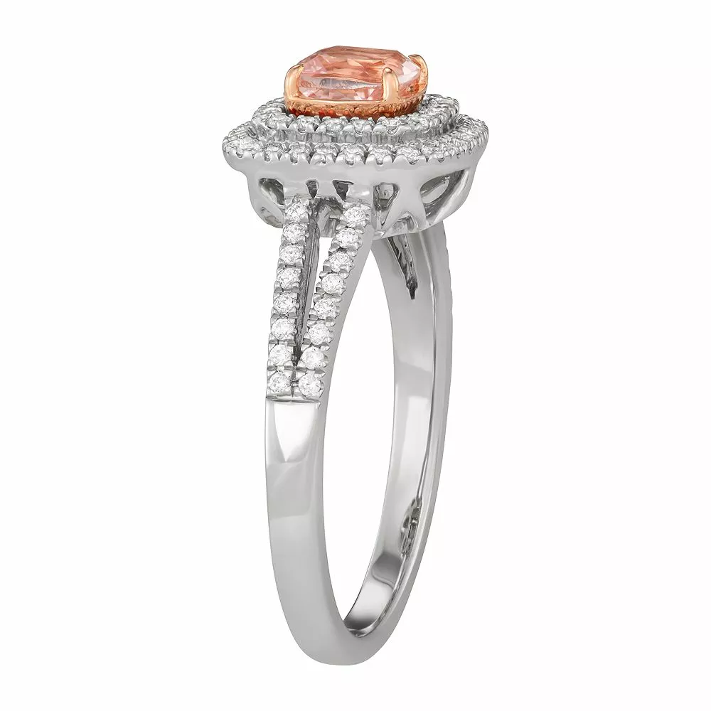 Beautifully decorated with a cushion-shaped morganite center stone and scintillating diamonds, this 14k white gold teardrop halo ring lends timeless elegance to your ensembles.
